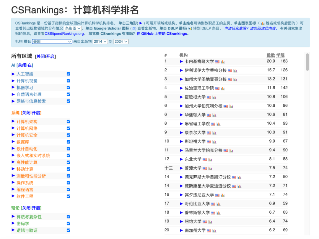 CSRankings(https://csrankings.org)是一个基于数据驱动的全球计算机科学机构排名系统。它由Emery Berger创建并维护,旨在通过客观的指标来评估各个机构在计算机科学领域的研究表现。自2017年以来,CSRankings一直为学术界和公众提供可靠的排名信息。