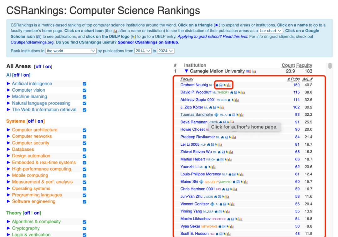 2、研究人员信息:点击某个机构的名称,可以查看该机构的教授和研究人员的详细信息,包括他们的主页链接、研究领域分布图、Google Scholar出版物链接以及DBLP条目链接。